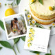 This elegant thank you card features a vibrant and timeless design inspired by lemon tree branches, where bright yellow tones blend with fresh greens to create a Mediterranean aesthetic full of harmony and warmth. The digital style provides a refined and polished finish, resulting in a visually charming composition that conveys joy and heartfelt appreciation. On the back, a customizable photo adds an intimate and personal touch, turning each card into a meaningful keepsake for your guests.