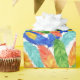 A seamless watercolor feather pattern painted in vivid blue, orange, green, and yellow hues.