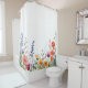 This vibrant watercolor wildflowers pattern shower curtain showcases a pattern with a lively mix of purple, orange, and red jewel-toned blooms.