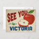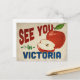 A charming Victoria Texas vintage travel postcard featuring a lovely red apple, along with fun retro style text that says, "See you in Victoria"