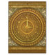 An ornately wooden framed baroque clock embellished with birds, flowers and plants in green and pink.. The frame has a burnished gold leaf look. The clock is in the centre of the frame, has a metal look in brass and is very detailed and decorative with gold numbers.