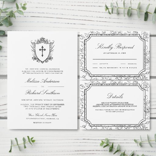 Amaze your guests with this elegant catholic wedding save the date featuring beautiful victorian crest with intricate details. Simply add your event details on this easy-to-use template to make it a one-of-a-kind save the date card.