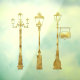 A variety of victorian lamp post lights in gold. Elegant winter window cling.