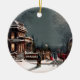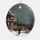 Beautiful vintage Christmas ornament of a Victorian home on a snowy night with guests arriving for a party by horse and sleigh.