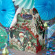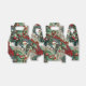 Father Christmas surrounded by greenery, with flowers, angels, children and ornaments in bright reds and greens.