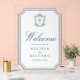 Elegant catholic wedding welcome sign featuring beautiful victorian crest with intricate details.