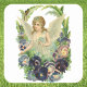 Vintage illustration religious Christianity image featuring a Victorian angel surrounded by pansy flowers. Beautiful floral image for the Easter holiday season. Victorian die cut.