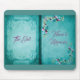 A victorian style open book with beautiful scroll design and is embellished with pink and purple roses against a teal background with a slight texture look. Very pretty. Personalize if you wish.