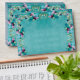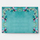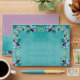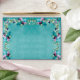A victorian style open book with beautiful scroll design and is embellished with pink and purple roses against a teal background with a slight texture look. Very pretty.