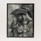 Three victorian girls in their fancy dresses and hats huddle together under an umbrella during a spring rain. Done in colours of black and white.
