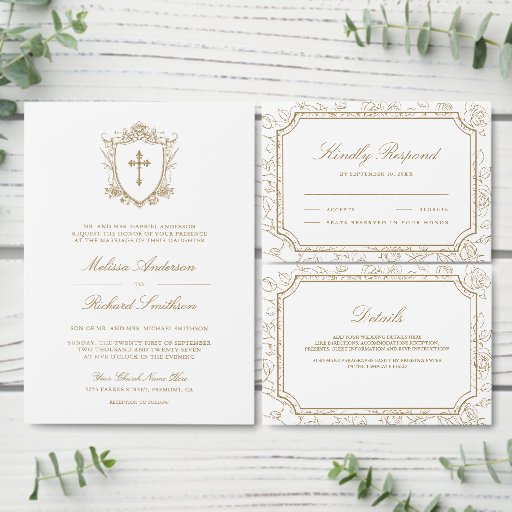 Amaze your guests with this elegant catholic wedding save the date featuring beautiful victorian crest with intricate details. Simply add your event details on this easy-to-use template to make it a one-of-a-kind save the date card.