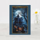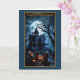 This Halloween card captures the quintessential spooky atmosphere of the holiday, perfect for those who enjoy a classic haunted theme. The central image is a towering, old Victorian-style house, shrouded in darkness and bathed in the eerie glow of a full moon. The house stands ominously amidst a graveyard filled with tombstones and twisted, leafless trees, creating a chilling backdrop.
