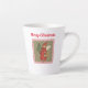 This Latte mug has a Victorian little angel dressed in a red hooded cape holding a decorated Christmas tree and presents on a tan background with falling snow in an ornate red frame. Customize the Merry Christmas text at the top with the template.