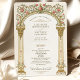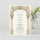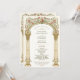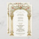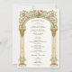 This elegant Victorian wedding program features a grand gold arch adorned with climbing vines of pink roses and delicate greenery. The intricate floral details and classic column design exude timeless sophistication and romantic charm. Perfect for couples seeking vintage-inspired wedding stationery with a luxurious aesthetic and a touch of floral elegance.
