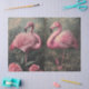 A vintage-style illustrations of a pink flamingos, inspired by 19th-century chromolithographs. This detailed artworks features the elegant birds standing among lush ferns, with vibrant pink roses in full bloom. Reflecting the fascination with exotic wildlife during the age of exploration, it evokes the charm of antique natural history prints.