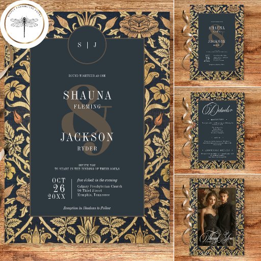 Indulge in the enchantment of the past with our vintage floral wedding invitations. Inspired by the iconic designs of William Morris, these invitations feature a mesmerizing blend of vintage hues - moody blacks, muted reds, soft tans, golds, and creams. The intricate floral patterns, reminiscent of the Art Nouveau era, exude a touch of darkness, adding a mysterious allure to your special day. The charcoal black text area, adorned with elegant vintage fonts, provides a striking contrast against the rich tapestry backdrop. This timeless design captures the essence of classic romance, making it the perfect choice for couples seeking a truly unique and unforgettable invitation. Created by Simply Farmhouse Press.