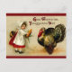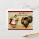 Vintage early 20th century Thanksgiving Day greeting. Cute little girl offering corn to a turkey.