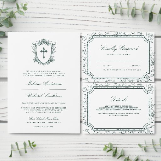 Victorian White and Emerald Green Catholic Wedding Save The Date