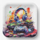 Birthday party paper plates. Ai watercolor illustration of headphones, video game controller and other gaming accessories.
