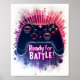 Video game console Controller Ready for Battle- A black console controller is depicted in a vibrant, stylized design. The controller is positioned front and centre, with a pink and purple colour scheme dominating the background. The background features a circular pattern of radiating lines, reminiscent of a sunburst, with splashes of colour creating a dynamic and energetic feel.