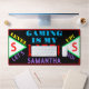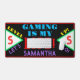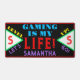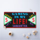 Amusants gamers vidéo gamer Nom dans la typographie violet clair. Motif géométrique avec Monogramme initial en rouge des deux côtés à l'intérieur de triangles vert et blanc brillant. Jouer est ma vie écrite en bleu clair et en rouge. Niveau supérieur allons écrire dans les couleurs jaune et violet. Arrière - plan noir avec garniture rouge. Design original par TamiraZDesigns.
