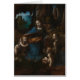 Léonard de Vinci, le quintessence de la Renaissance ; peintre, sculpteur, inventeur, anatomiste et visionnaire ; n'était pas seulement un maître de la technique artistique, mais un génie qui comblait le fossé entre l'art et la science. Né en 1452, sa curiosité insatiable et sa soif de connaissance le conduisent à disséquer les cadavres, étudier la fuite des oiseaux, et rêver de machines volantes des siècles avant leur époque. — L'une de ses oeuvres les plus captivantes, bien qu'enveloppée d'un mystère, est la deuxième version de "Madonna des Rochers". Peint vers 1508, il réside dans la National Gallery de Londres. Ici, au milieu des ombres cool d'une grotte, se déroule une scène sacrée. — La Vierge Marie, drapée de robes de bleu saphir, s'agenouille dans le respect. Ses yeux doux et sa douce expression parlent de dévotion tranquille, jetant une lumière douce sur l'enfant Christ niché au centre. Le jeune Jésus, baigné dans cette lueur éthérée, tend la main avec un geste de bénédiction envers son cousin, Jean le Baptiste. — Jean, un petit garçon, s'agenouille à côté de Jésus. Versé dans les peaux rugueuses d'un animal, un petit bâton surmonté d'une croix serrée dans sa main, il regarde Jésus avec un regard conscient. Son autre main offre un bol rempli d'eau claire, un indice subtil du rôle qu'il jouera dans l'avenir. — Derrière Jean s'agenouille une figure angélique, leur présence murmure le divin. Habillé de robes cramoisi et émeraude, l'ange se dirige vers Jean, créant une conversation silencieuse entre les figures. Peut-être sont-ils des gardiens, qui surveillent ces saints enfants confiés à leurs soins. — L'air pend lourd avec une autre sérénité mondaine. La lumière du soleil filtre à travers des fissures invisibles dans les falaises rocheuses qui forment le fond, illuminant un monde de piscines de grottes luxuriantes plantes et cool. La scène est celle de la contemplation tranquille, un moment tendre suspendu dans le temps entre ces saints personnages. Bien que les interprétations puissent varier, une chose est sûre : la "Vierge des Rochers" de Léonard de Vinci est une représentation captivante de la foi, de l'innocence et des liens sacrés qui cravate l'humanité au divin.