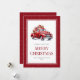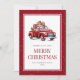 Watercolor Joyeuse carte de Noël avec un vieux camion rouge portant des cadeaux de Noël. Personnalisez facilement cette carte de Noël de camion rouge enneigé avec votre nom de famille et l'année.