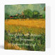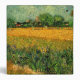 View of Arles with Irises in the Foreground by Vincent van Gogh is a vintage fine art post impressionism landscape nature painting. A wheat field with purple iris flowers in the foreground on a farm. Trees and the town of Arles with houses are in the background.