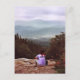This postcard features photography of one of the wonderful hikes in the White Mountains of New Hampshire. A hiker has followed the Nancy Pond Trail all the way to the Norcross Pond outlet which affords spectacular views of the Pemigewasset Wilderness, Mt. Bond, the Twin Range and the Franconia Mountain Range. He has laid his hiking stick on the rocks and is resting on a large granite slab. He is wearing a red bandana and a lilac purple shirt which says: Support Jazz. The vista is magnificent with sky and mountains in a colour range of blue, green and mauve.