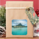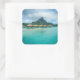 Square photo sticker of a luxury overwater thatched roof bungalow resort in a vacation resort in the clear blue lagoon with a view on the tropical island of Bora Bora, near Tahiti, in French Polynesia.