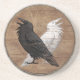 A quality sandstone drink coaster featuring Odin's ravens as a cool twist on the Ying Yang symbol over beautifully weathered wooden Viking shield background.