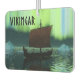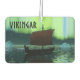 A slightly stylized image of a Viking longship sailing at night under the Northern Lights there a couple of icebergs; most of the crew is asleep. Text reading "VIKINGAR" (Vikings) also appears.