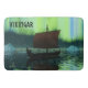 A slightly stylized image of a Viking longship sailing at night under the Northern Lights there a couple of icebergs; most of the crew is asleep. Text reading "VIKINGAR" (Vikings) also appears.