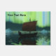 A slightly stylized image of a viking longship sailing at night under the Northern Lights there a couple of icebergs; most of the crew is asleep. Add your own text.