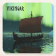 A slightly stylized image of a Viking longship sailing at night under the Northern Lights there a couple of icebergs; most of the crew is asleep. Text reading "VIKINGAR" (Vikings) also appears.