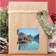 Square souvenir sticker of a landscape with boathouses in the village of Fjærland (Mundal) and mountains with reflection in the water of the fjord Fjærlandsfjord, Sogn og Fjordane in Norway.