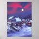 A small village in the mountain in the winter, blue and red sky and the moon is shining in the sky. This is a AI generated art.