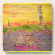 shows beautiful sunset over provincetown with boaters and pilgrim tower from original watercolour with "village sunset" slogan !