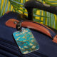 Vincent Van Gogh art on a luggage tag. His beautiful masterpiece with turquoise background and blossoming almod tree