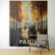 A vintage travel poster showcasing a romantic 1930s Paris street scene. The Eiffel Tower stands elegantly in the background, framed by autumnal trees with golden leaves. Classic cars and streetlamps line the wet cobblestone road, capturing the charm of Paris in a bygone era. The word “PARIS” is prominently displayed at the bottom in bold letters, emphasizing the city’s timeless allure.
