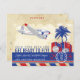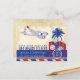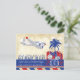 A vintage inspired postcard save the date for a travel themed wedding. Shown in shades of royal blue, bright red, white and grey. Customize with your names, wedding date and wedding destination!