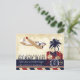 A vintage inspired postcard save the date for a travel themed wedding. Shown in shades of navy blue, dark red, white and light brown. Customize with your names, wedding date and wedding destination!