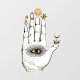Alchemy themed window cling features vintage Hand of Mysteries illustration on dark distressed harlequin background. The alchemical symbol of apotheosis, the transformation of man into god, is traditionally represented by an image of a hand with other symbols, including skulls, crowns, stars, fish, keys, lanterns, astrological symbols and the all-seeing eye.