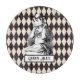 Vintage Alice in Wonderland illustration is Alice putting on a crown. Background is textured charcoal and ivory harlequin pattern. Personalize text