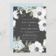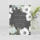 A sophisticated modern wedding invitation with a vintage feel. This design features a dark grey background, a watercolor floral surrounding frame with white anemones and green leaves. Your details are in modern white font, and the reverse is in solid light blue.
