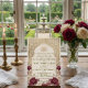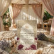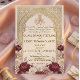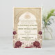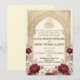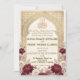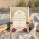 Celebrate your union with timeless elegance. This formal Nikah design features deep marsala blooms, vintage parchment, and traditional Islamic geometry.This design presents a sophisticated composition anchored by a central geometric arch featuring an intricate arabesque lattice pattern in a printed faux gold hue. The visual hierarchy begins with the Arabic "Bismillah" calligraphy at the apex, gracefully flowing into the formal English typography below. The arch is framed by lush watercolor botanical clusters, highlighting deep burgundy and marsala roses paired with dusty pink peonies and cream accents against a textured, aged parchment background. The typography combines a traditional serif font for body text with an elegant script for names, creating a balanced, high-end editorial look.This is a flat printed image with a faux gold foil and parchment texture effect, not actual raised material or metallic foil.