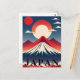 Celebrate the Land of the Rising Sun with this bold Japan Travel Postcard. This unique Geometric Art Deco design features the iconic snow-capped peak of Mount Fuji set against a massive, stylized red sun and vibrant blue sky.