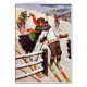 Vintage artwork by Arthur Thiele depicts a comical scene on the slopes where a couple is snow skiing. The woman is either a novice or has gotten herself out of control on her skiis. In an attempt to stay upright and come to a stop, she grabs the man around the neck, pulling his head back and covering his eyes so that he can't see where he's headed. He sideswipes a fence, but her skiis are headed right into the fence. Other skiiers around them look on in disbelief. The German artist, Carl Robert Arthur Thiele (1860-1936) commonly went by the name Arthur Thiele. He was an illustrator of books, sheet music and postcards. He was famous for his comical anthropomorphic animals dressed in clothing and depicted in human-like scenes. Dachshunds were a favourite subject of his. In addition to animals, other subjects he illustrated were sports postcards, vegetables brought to life, snowmen, bathing beauties, and WW1 era propaganda postcards. The Internet is full of references confusing Carl Robert Arthur Thiele with another German painter of his time named Julius Arthur Thiele who painted landscapes. They are not the same artist. This card is blank inside for your own message.