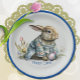Remove or replace the text on these adorable vintage watercolor style Easter themed paper plates. Designed with a baby bunny rabbit wearing a cutely detailed floral print coat with two Easter eggs and spring flower accents on shades of blue. Look for matching cups, napkins and other items in this same design collection.