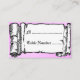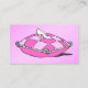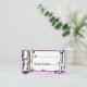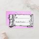 A custom party table placecard with an etching of a banner with scrolls and csutom blackletter with vintage art of Cinderella's glass slipper on a pillow in light and dark pink.
